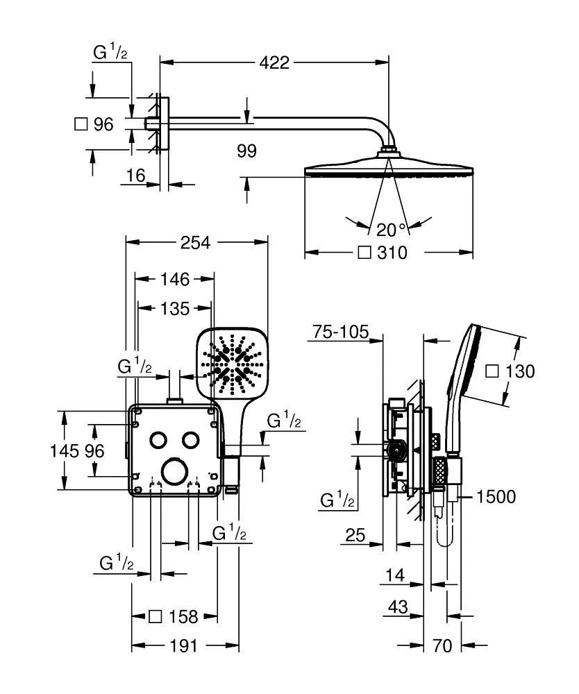 Душевая система встраиваемая, черный Grohe Grohtherm SmartControl CUBE 310 34865KF0