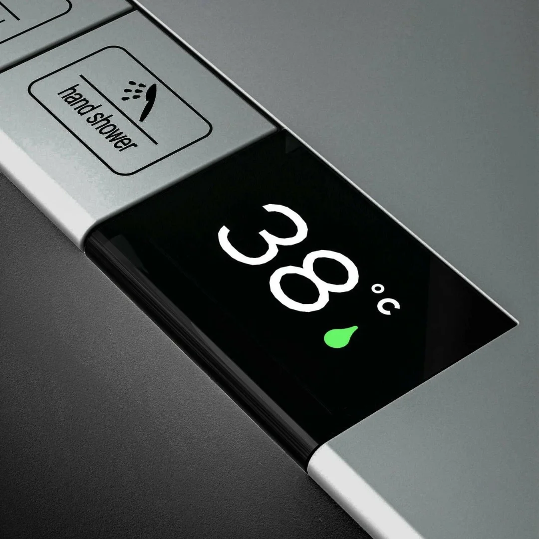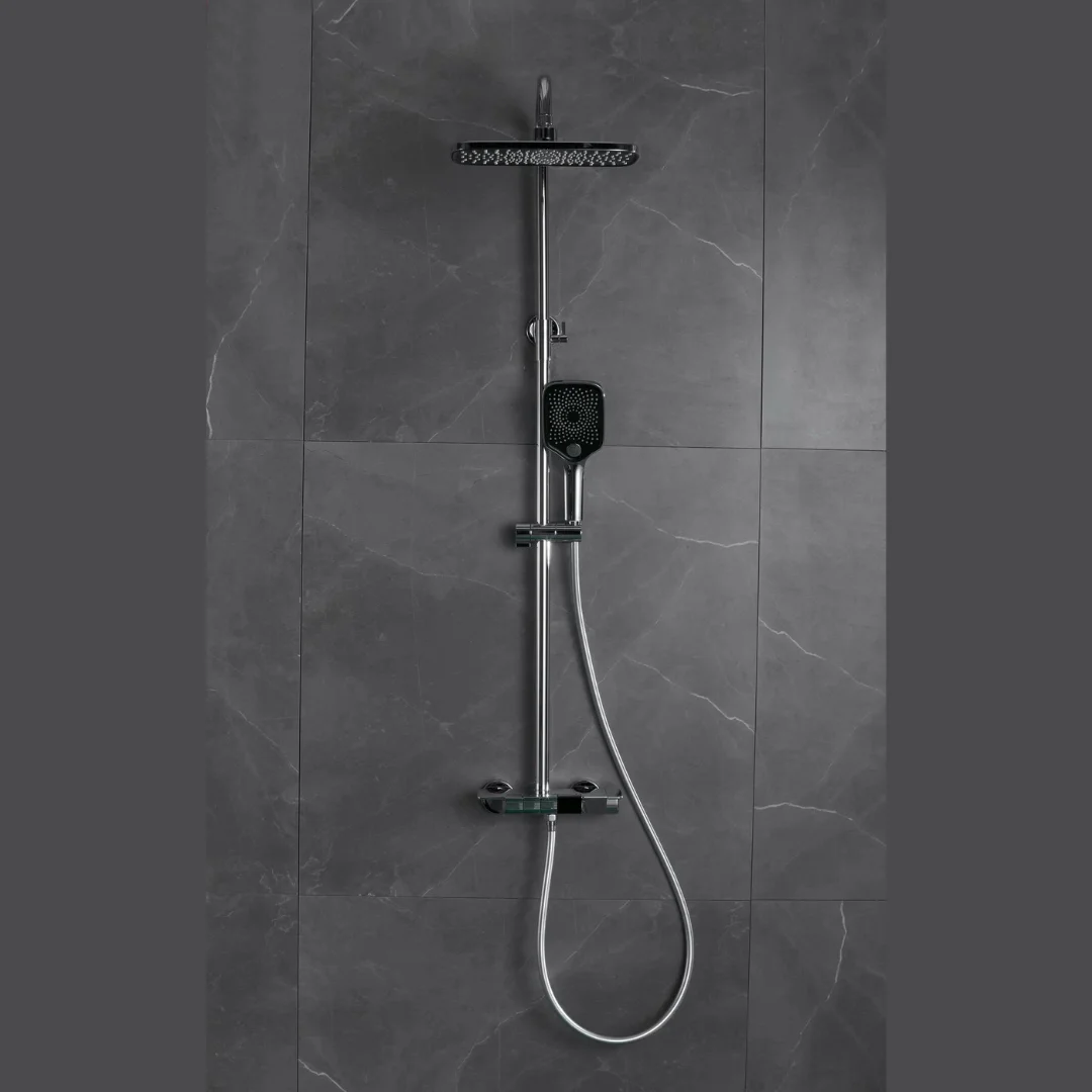 Душевая система Esko с термостатом и тремя режимами струи в хромированном цвете оснащена дисплеем и датчиком температуры. Смеситель оснащен массивной полкой и кнопочным управлением режимами, что позволяет включать несколько режимов одновременно. Гидроиндикатор температуры воды отображает фактическую температуру потока воды, при этом питание электрических датчиков осуществляется за счет проходящего потока воды. Также система включает скрытый излив и ручной душ с кнопочным управлением, который поддерживает три режима работы.
