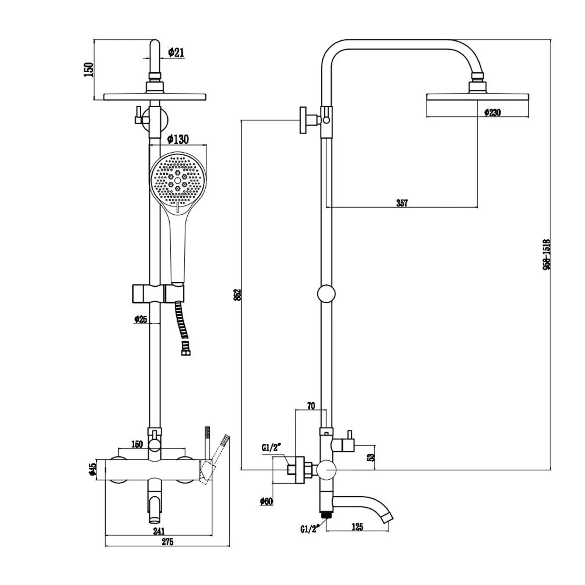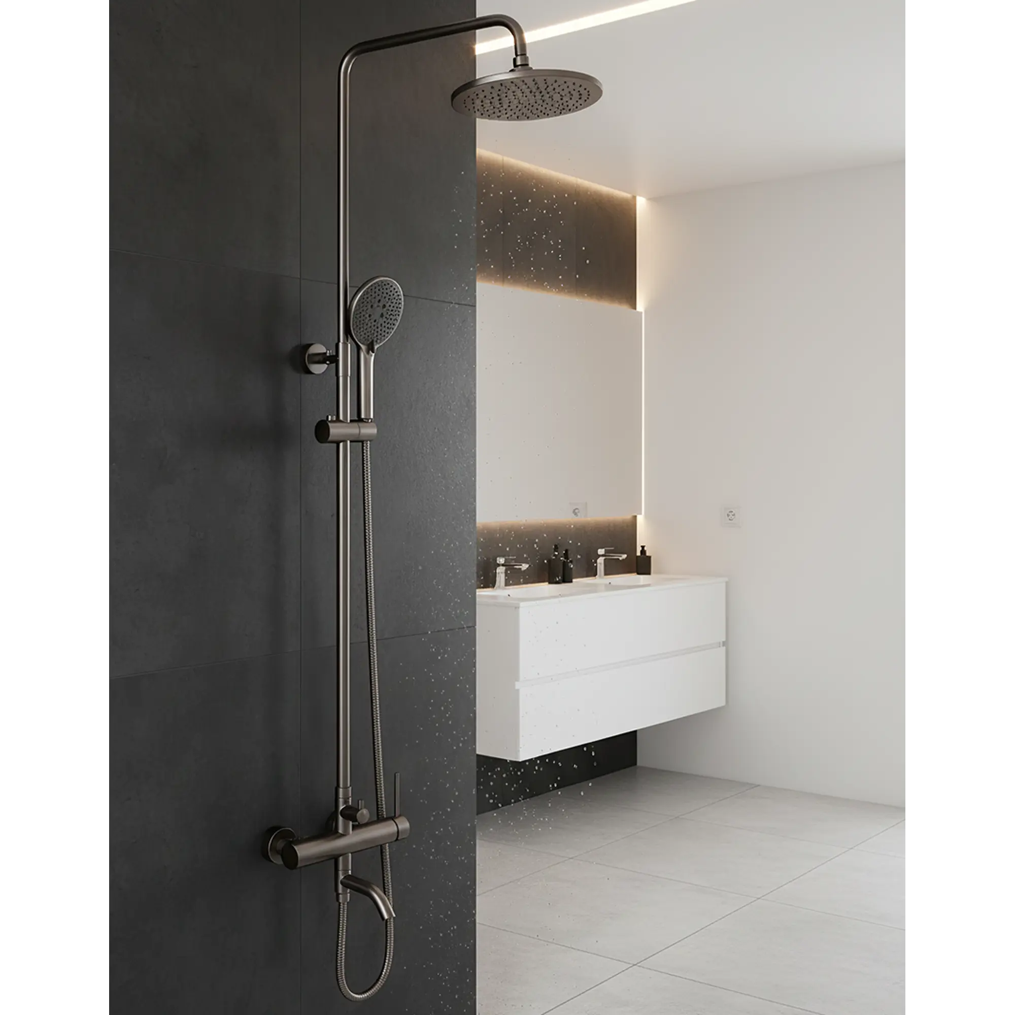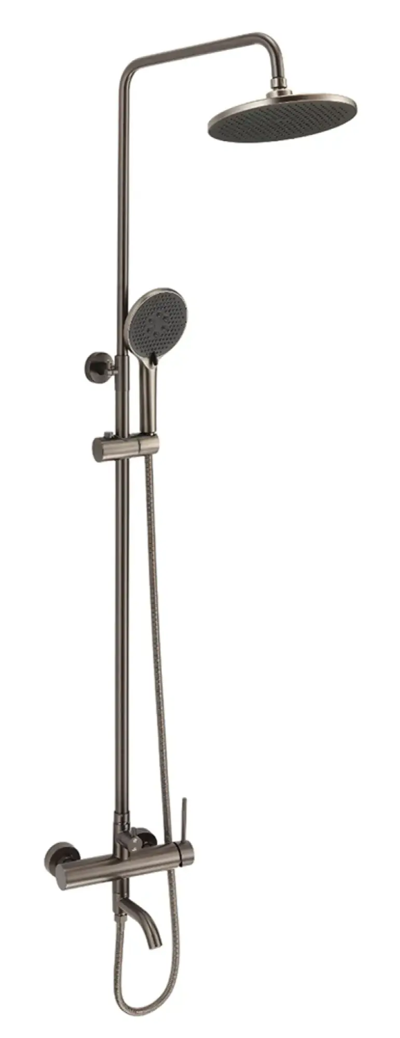 | Комплектация | В комплект входит: металлический шланг 1;5 м верхняя (диметр 23 см.) и ручная (3 режима; диаметр 13 см. ) лейки душевая штанга смеситель дивертор держатель для лейки ;монтажный комплект |