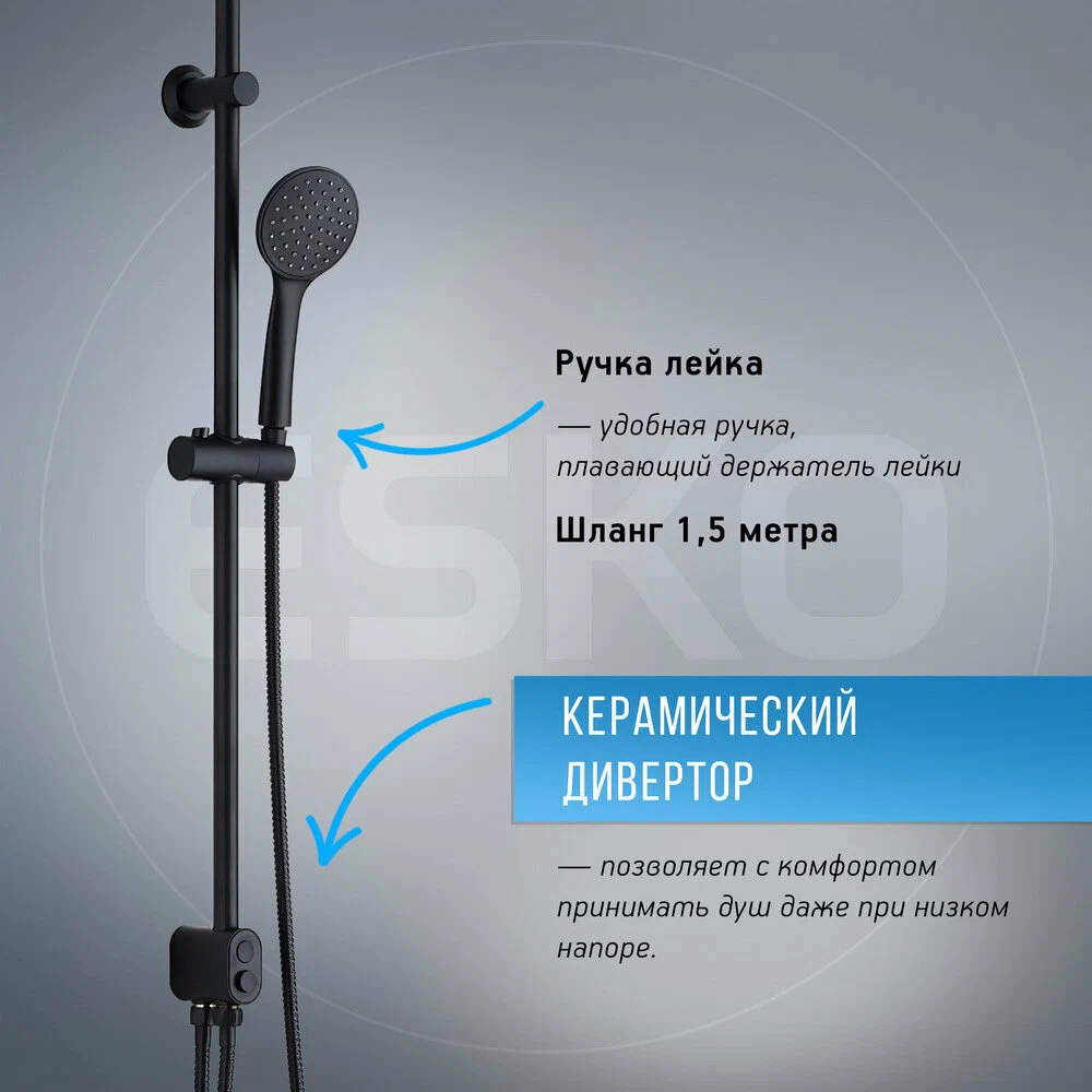Душевая система ESKO ST1550 Black — это элегантное и функциональное решение для вашей ванной комнаты, предоставляющее современный дизайн и удобство в использовании.