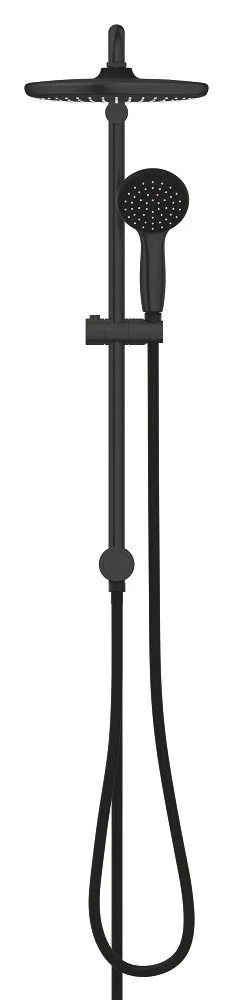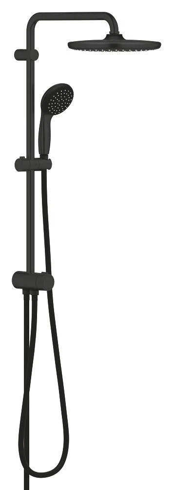 Душевая система с переключателем Grohe Vitalio Start System QuickFix 250 в черном матовом цвете предлагает превосходное сочетание функциональности и современного дизайна. Система оснащена горизонтальным душевым кронштейном длиной 390 мм, который можно регулировать перед установкой, и переключателем на 3 положения: верхний душ, ручной душ и верхний душ с Eco-режимом.