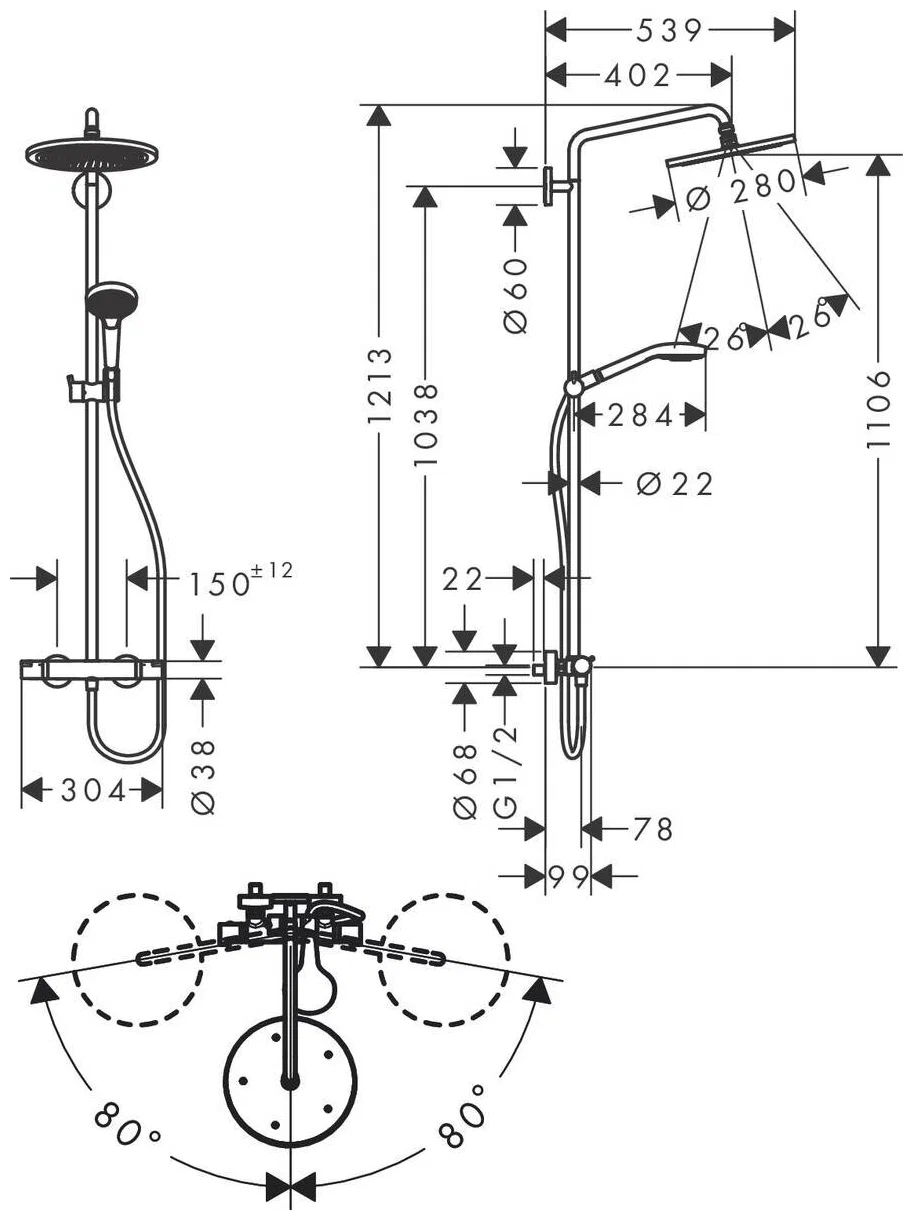 | Комплектация | Душевой шланг 160 см; Верхний душ 280 1jet; Ручной душ 120 3jet |