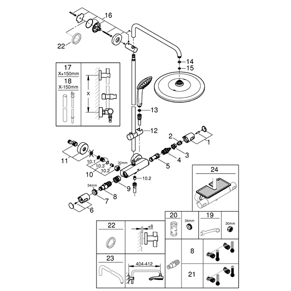 Металлическая розетка; Эксцентрики; Верхний душ; Кронштейн; Душевой шланг; Держатель для душевой лейки; Душевая лейка; Штанга душевая; Термостат