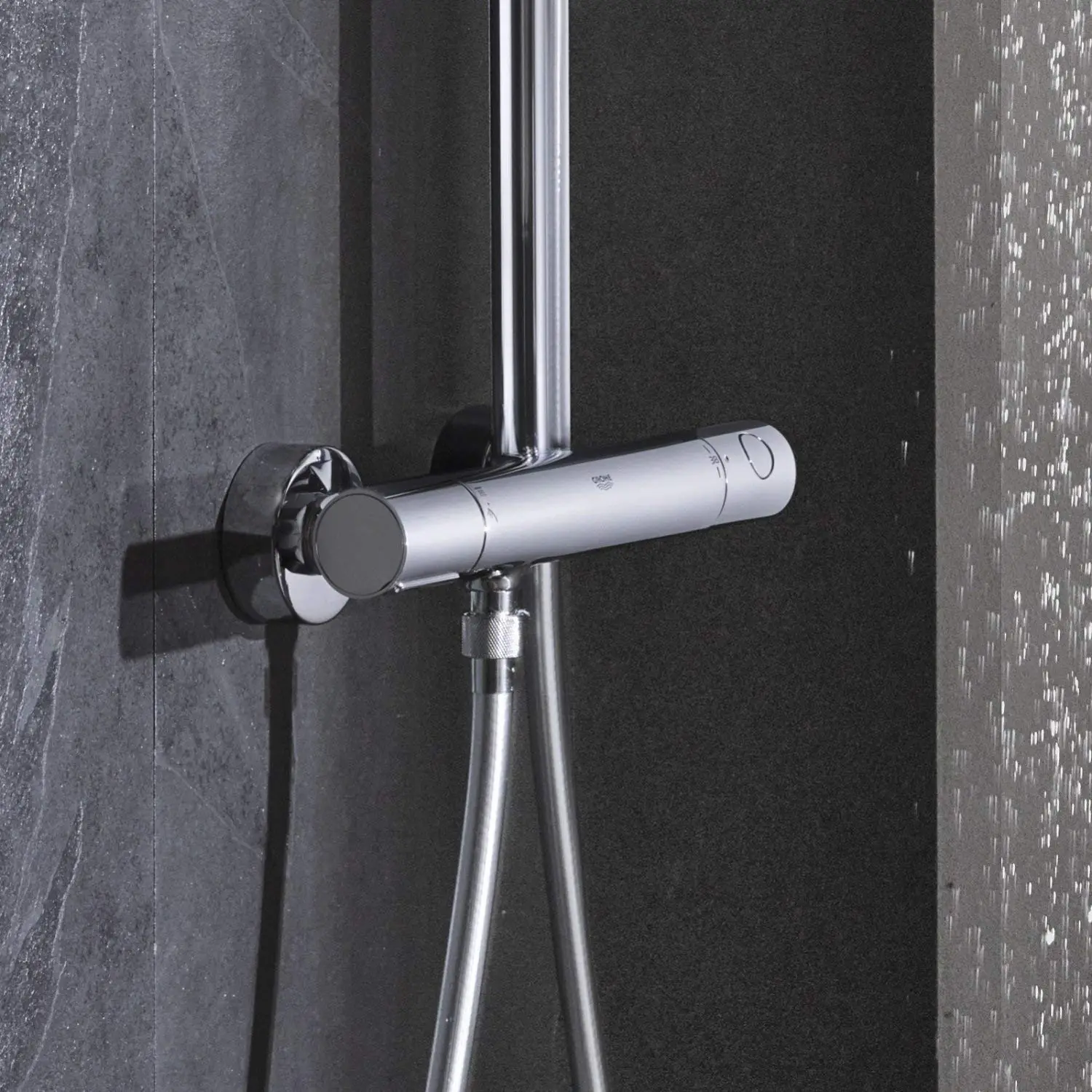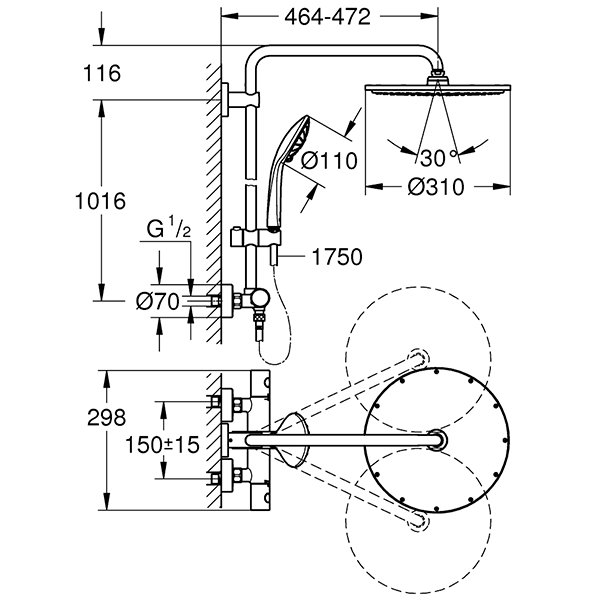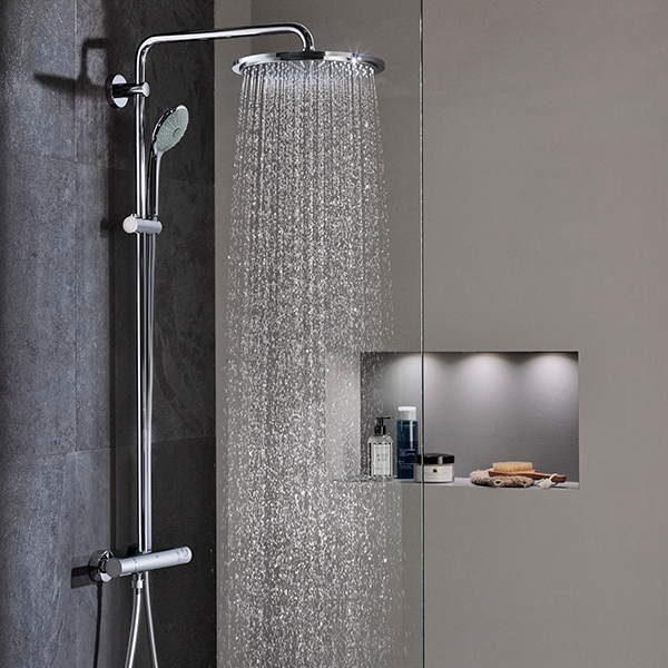 Горизонтальный душевой кронштейн 450мм; настенный термостат с аквадиммером; душевая струя; с шаровым шарниром; доп опция — полочка GROHE EasyReach