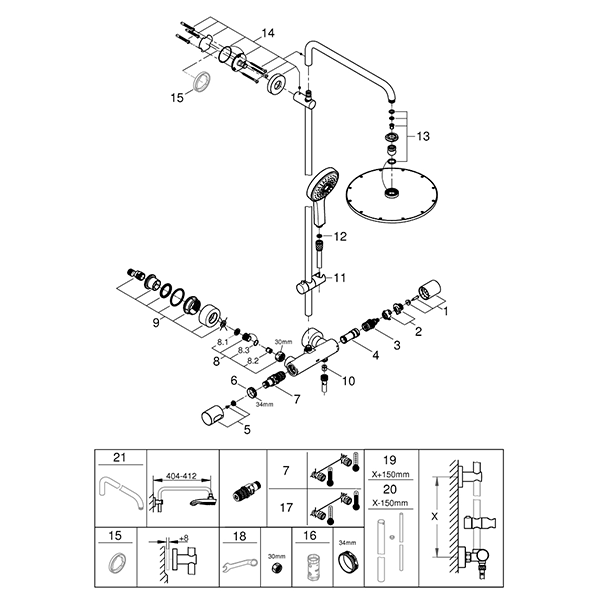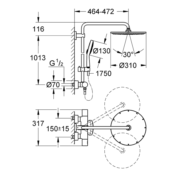 | Комплектация | Горизонтальный душевой кронштейн 450мм; настенный термостат с аквадиммером |