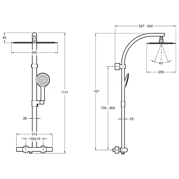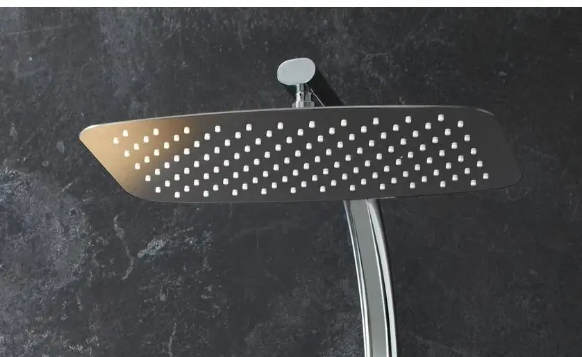 с термостатическим смесителем; металлический прямоугольный верхний душ 400*250 мм; гибкий нескручивающийся шланг 1600мм; ручной душ диаметром 120 мм в отделке хром ( расход воды 10л/8мин); встроенный переключатель на ручке; система холодного корпуса