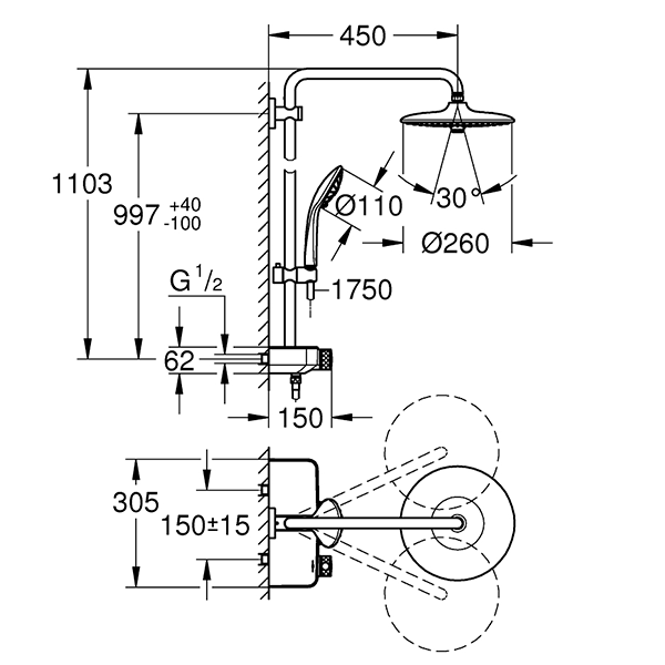 26509000 Euphoria SmartControl System 260 Mono Душевая система с термостатом для настенного монтажа