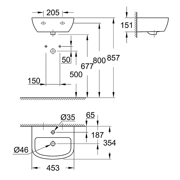 Настенная мини-раковина Grohe Bau Ceramic 39424000: компактная альпин-белая раковина шириной 45 см без крепежей, идеальная для небольших пространств и современных интерьеров.