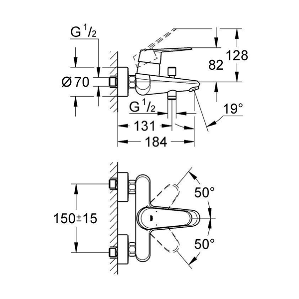 33390002 Eurodisc Cosmopolitan Смеситель однорычажный для ванны DN15 настенный монтаж