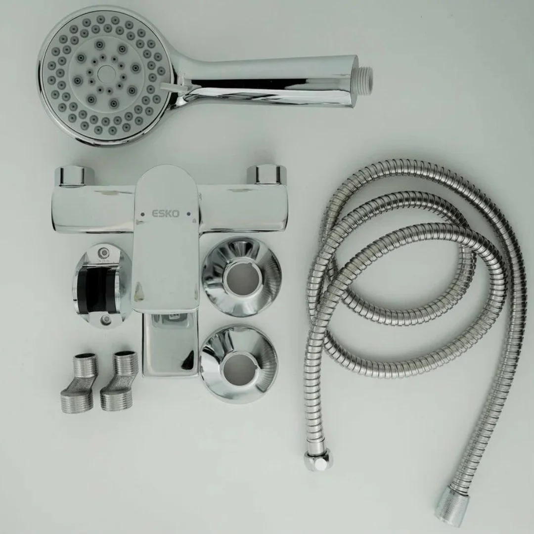 Смеситель для ванны и душа Esko Eiger, в комплекте с душевым гарнитуром, выполнен в глянцевом хромовом цвете. Корпус смесителя изготовлен из латуни категории А, что обеспечивает его прочность и долговечность. Он оснащен универсальным картриджем ESKO диаметром 35 мм, который гарантирует надежное смешивание горячей и холодной воды. Комплектация включает эксцентрики и отражатели для удобного монтажа. В набор также входит душевой шланг длиной 150 см в металлической оплетке, душевая лейка с пятью режимами работы и настенный держатель для лейки, что обеспечивает комфортное использование душа.