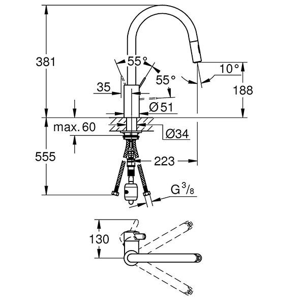 Выдвижная лейка DUAL; переключатель: ламнарный режим струи/душевой режим струи SpeedClean; с защитой обратного клапана Grohe EasyDock легкое вытягивание и возврат на место выдвижного; Zero раздельные пути подачи воды