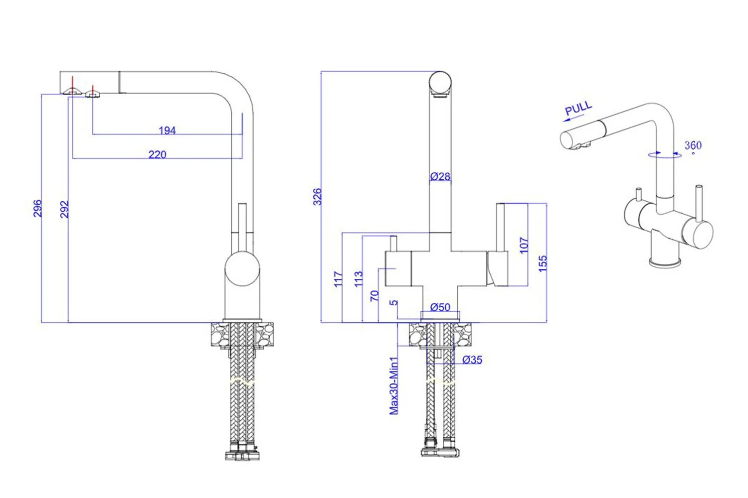 Смеситель для кухни, с подключением к фильтру и вытяжным изливом, нержавеющая сталь ESKO K112