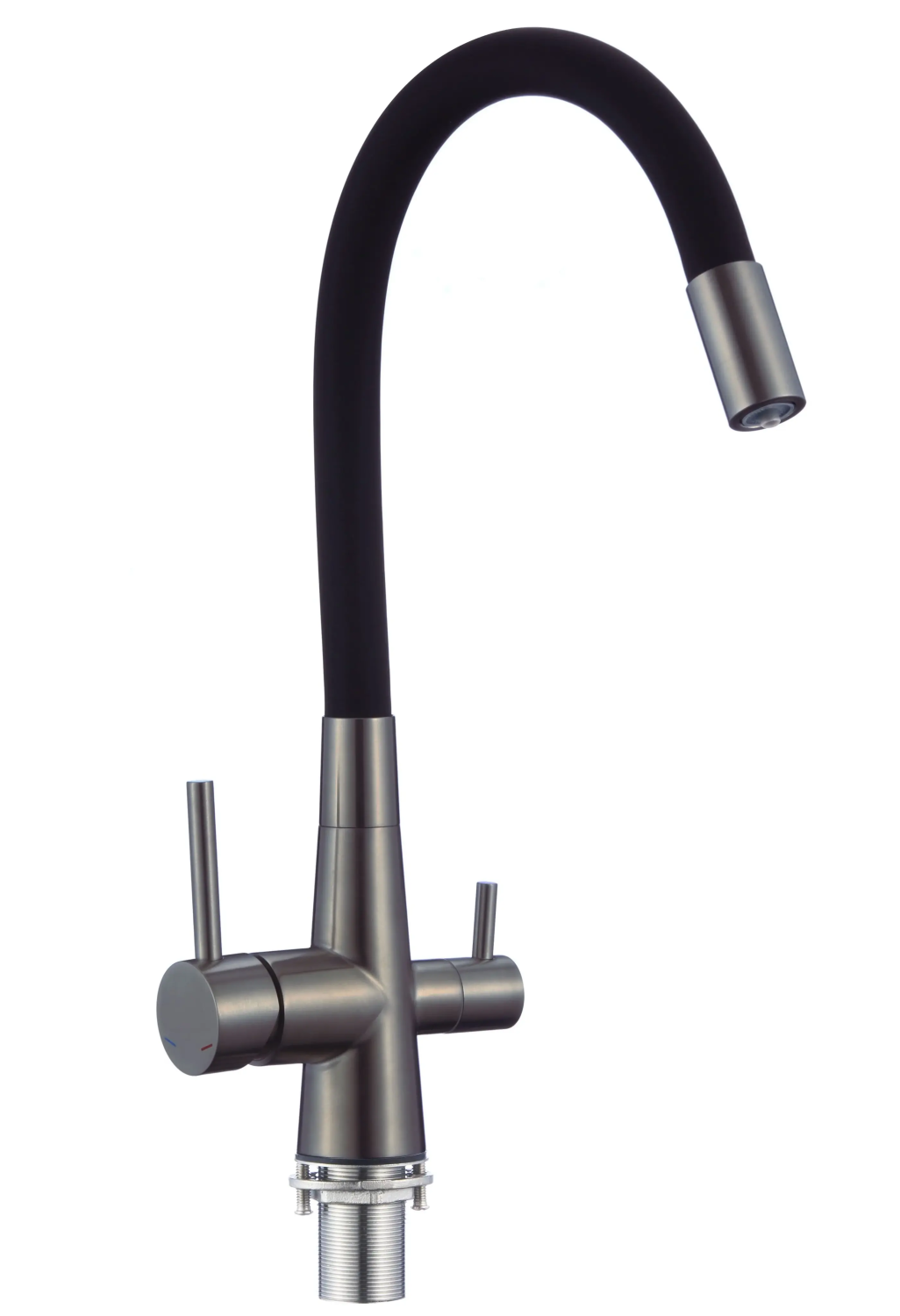 Смеситель для кухни, с подключением к фильтру, графит/черный ESKO Coral CL03GMB — это решение, объединяющее в себе эстетику, удобство и инновационный подход к организации водоснабжения. Модель выполнена в стильном сочетании графитового корпуса и черного излива, что делает ее гармоничным дополнением к интерьеру современной кухни. Главная особенность смесителя — возможность подключения к системе фильтрации, что позволяет использовать его и для подачи обычной водопроводной воды, и для получения чистой питьевой. Благодаря двум независимым каналам вода из фильтра не смешивается с водопроводной, сохраняя вкус и качество.