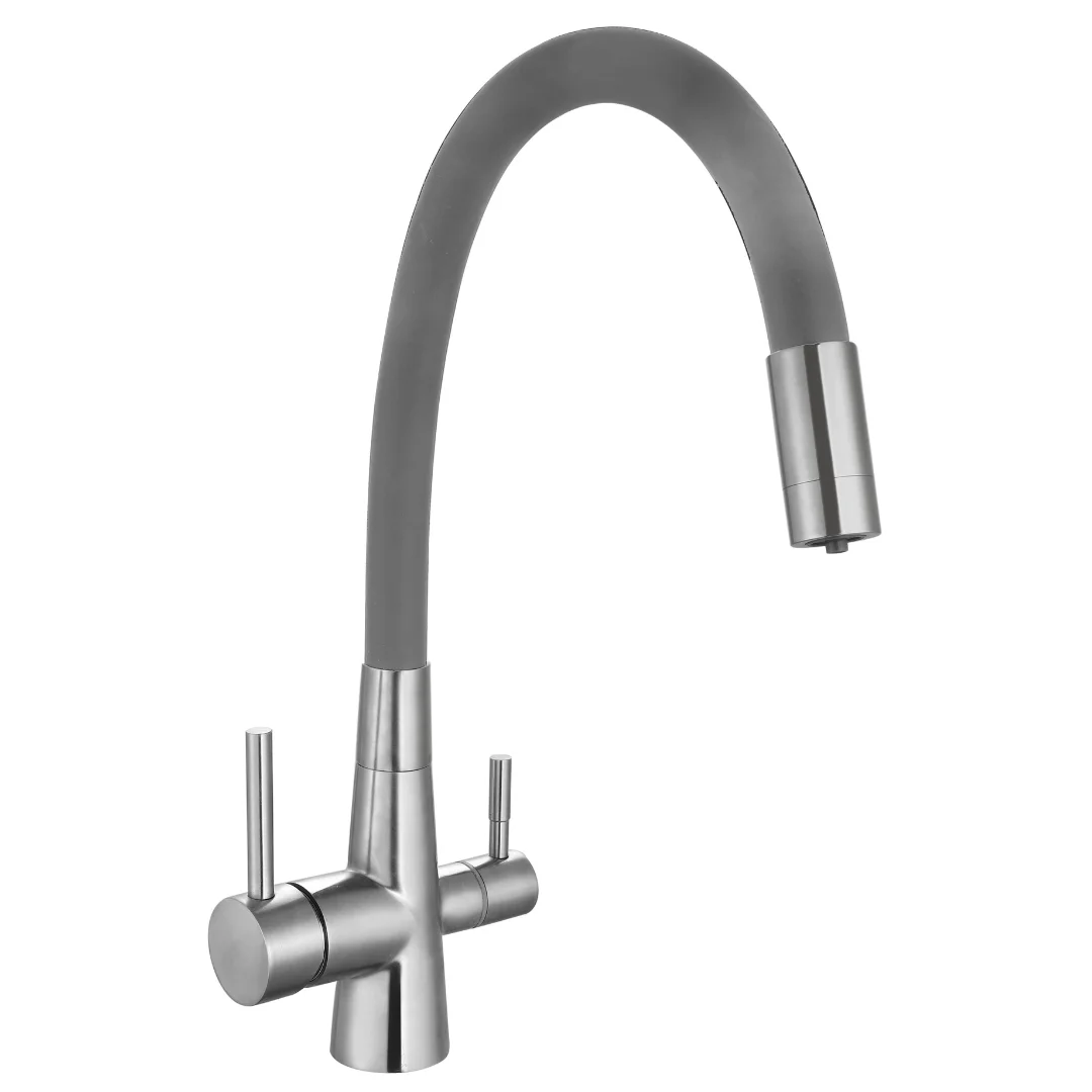 Смеситель для кухни ESKO Coral в нержавеющем сером исполнении – это идеальное сочетание функциональности и элегантного дизайна, созданное для удобства и долговечности. Корпус смесителя выполнен из нержавеющей стали SUS 304, что обеспечивает высокую стойкость к коррозии и долговечность. Он оснащен отдельным каналом для фильтрованной воды с собственным аэратором и ручкой включения, что позволяет удобно использовать как обычную, так и фильтрованную воду.