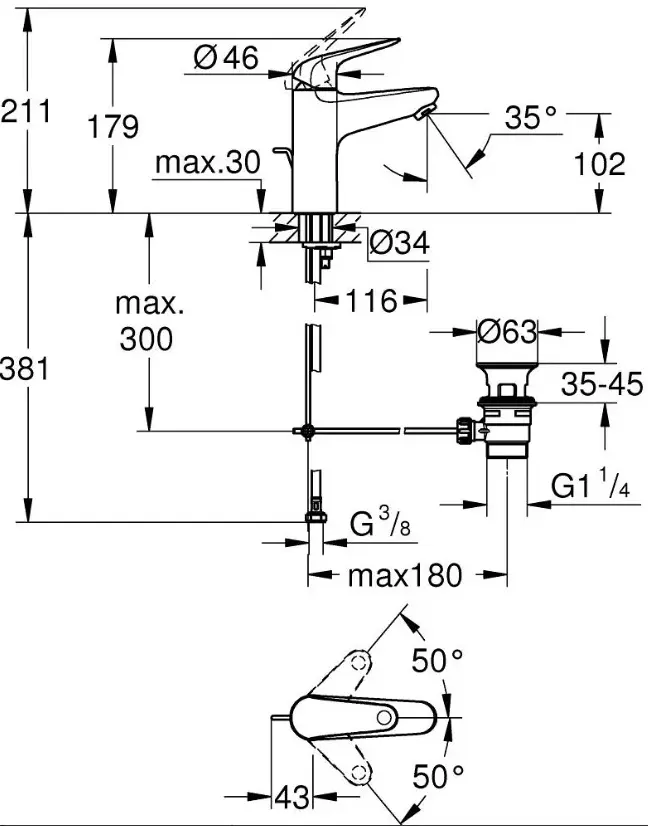 Смеситель для раковины с донным клапаном, размер M, хром Grohe Euroeco 24265001
