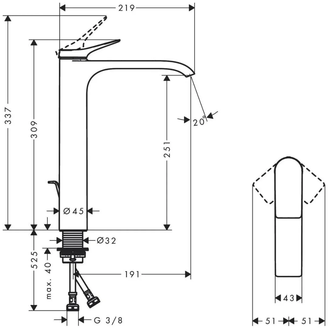 Смеситель для раковины Hansgrohe Vivenis 250 в черном цвете предназначен для установки на раковину и включает в себя однорычажный смеситель и сливной клапан. Он обладает ComfortZone 250, что обеспечивает комфортное пространство между изливом и раковиной. Смеситель имеет выступ 191 мм и высоту излива 251 мм, что обеспечивает удобство использования. Рычажная ручка позволяет легко регулировать поток и температуру воды. Тип струи — WaterfallStream, создающая широкий и мягкий поток воды, напоминающий водопад.