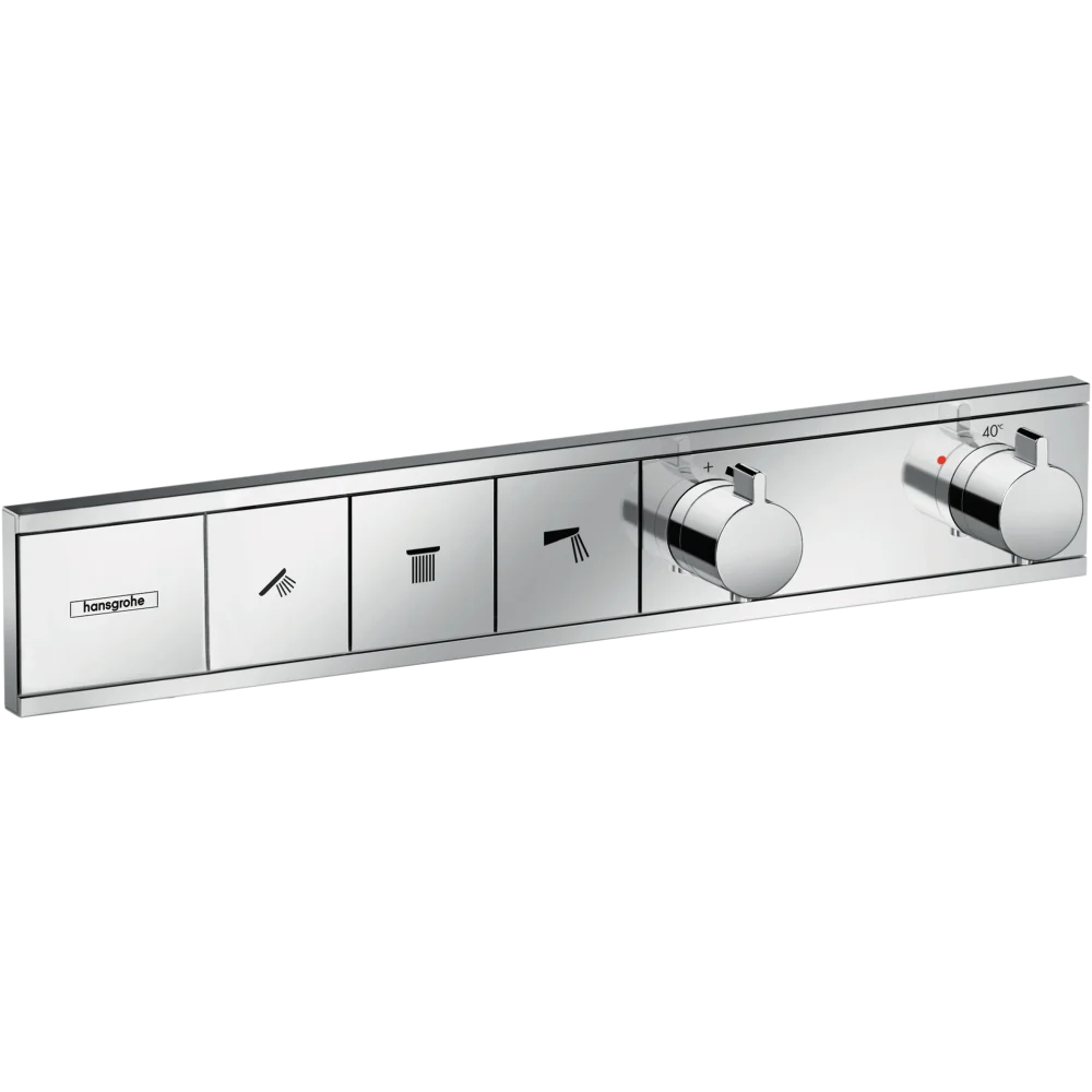 Термостат для душа, встраиваемый, для 3 потребителей, хром Hansgrohe RainSelect 15381000 — большая плоская лицевая панель с тремя широкими кнопками Select позволяет включать и комбинировать до трёх водоразборных точек. Каждая функция активируется простым нажатием: «клик» — и выбранный поток идёт. Термостат стабилизирует температуру, защищая от перепадов давления в системе, а ограничитель SafetyStop 40 °C повышает безопасность. Глянцевый хром подчёркивает чистую геометрию панели и легко сочетается с любой современной сантехникой Hansgrohe.